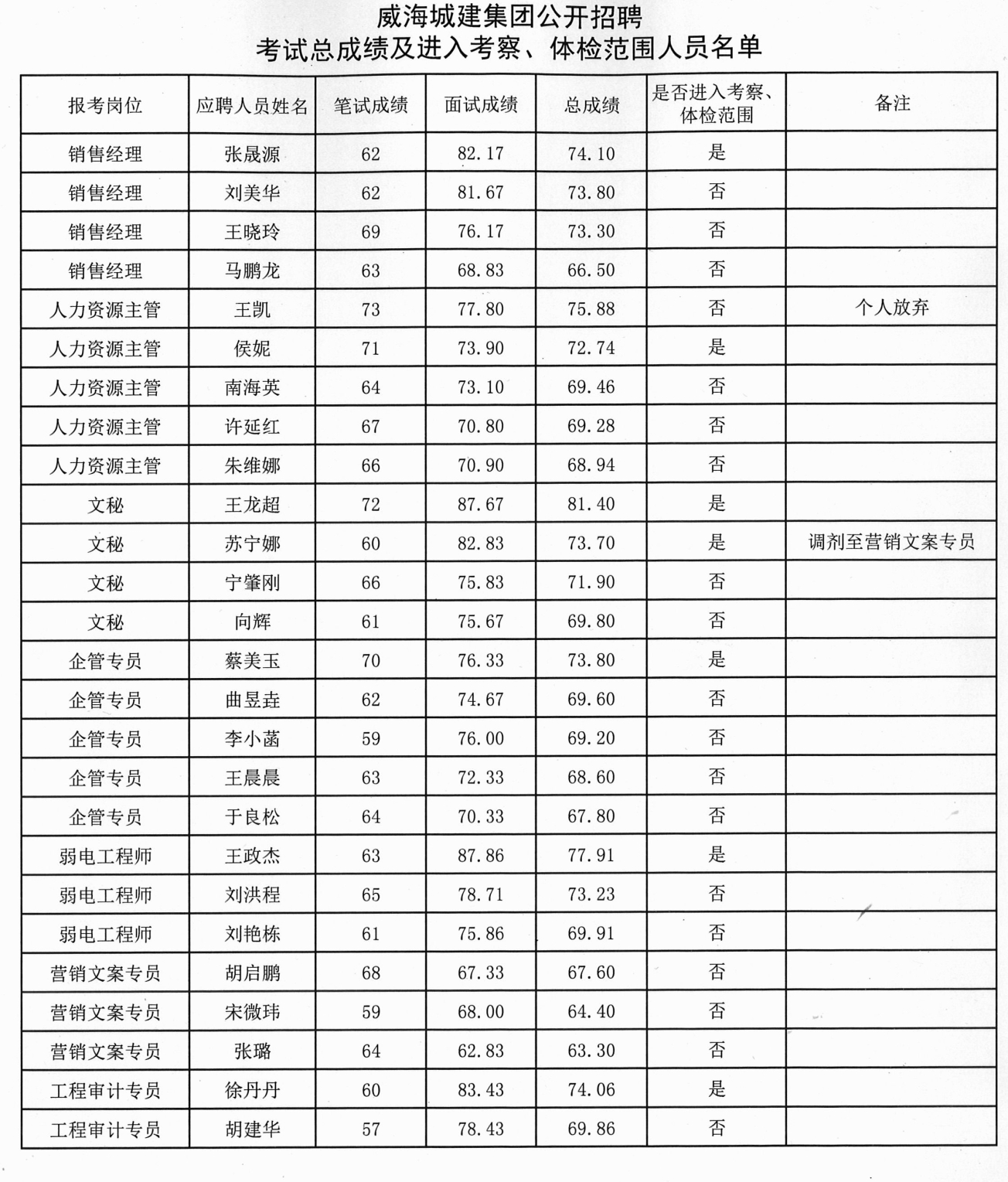 威海城建集團(tuán)公開(kāi)招聘考試總成績(jī)及進(jìn)入考察、體檢范圍人員名單 :