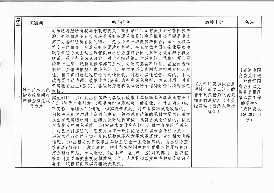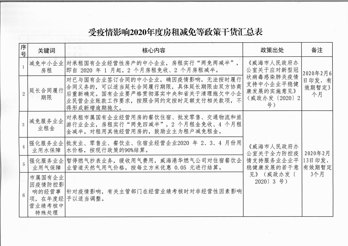公 告 為全面落實(shí)“六穩(wěn)”、“六?!比蝿?wù),進(jìn)一步推動國有企業(yè)房租減免政策落地落實(shí),現(xiàn)將《受疫情影響2020年度房租減免等政策干貨匯總表》及監(jiān)督投訴電話予以公告。承租戶如有需要投訴或反映的問題,請撥打市國資委監(jiān)督電話5187518。