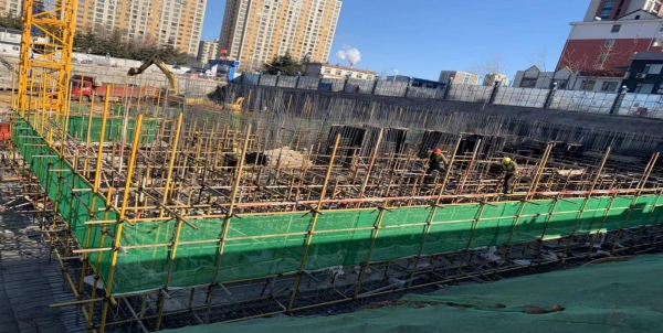 4#樓筏板基礎(chǔ)施工完成,正在綁扎地下2層剪力墻鋼筋及模板支護工作;