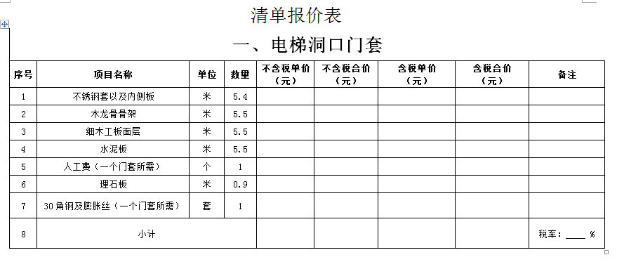 (5)采購范圍:電梯洞口門套、鋼爬梯、電梯機(jī)房洞口封堵、包轎廂、地面找平、地下車庫出入口真石漆等(詳見清單)等相關(guān)工作,具體內(nèi)容詳見采購文件。
